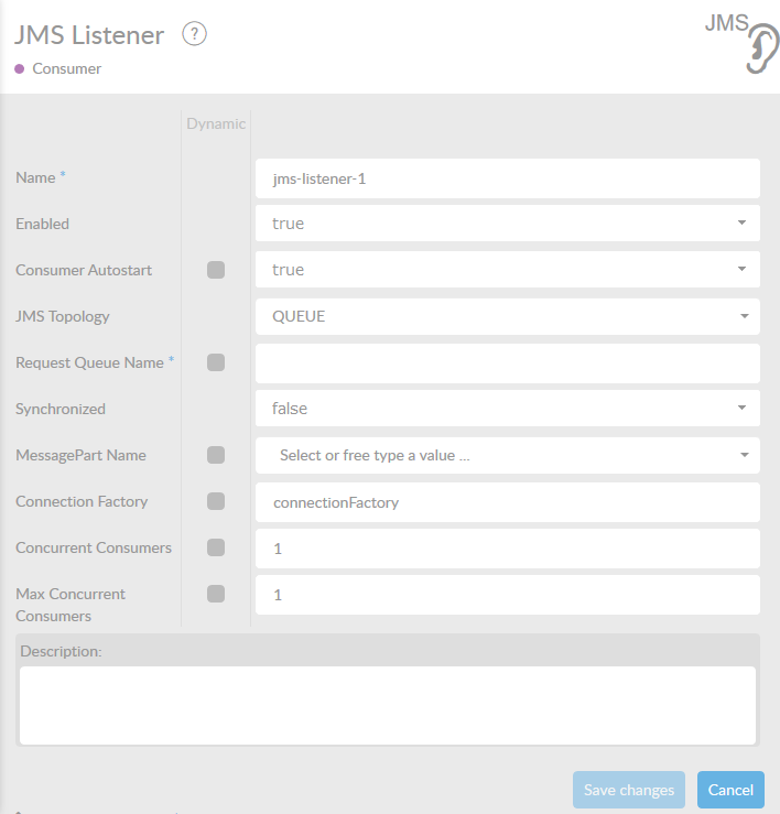 This listener is a message-driven listener. This means that the arrival of a message on the destination queue or topic, will activate the consumer. The listener’s output is a ConnectMessage.
