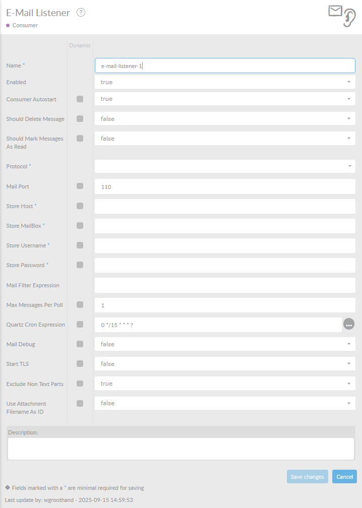 Definition of the interval this polling consumer will check for messages. Watch out! Email providers do not like it when you poll information from the server every 1 second. We noticed that this can lead to a chatty blockade of your emailbox. We strongly advice to set the cron to a minimum of 10 to 15 minutes. It defaults to every 15 minutes. |