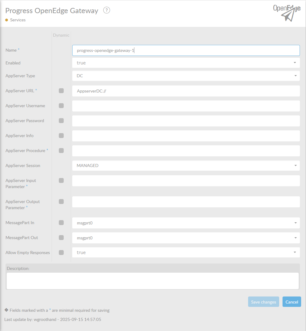 This service is used to call an OpenEdge procedure. The input parameter is filled with the text content of the MessagePart-In of the ConnectMessage. If there are more input parameters, you have to send a multipart message into the procedure. Use MessagePart-in with value 'ALL'.